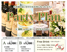 ※会場費(2時間)無料 ※基本設備(マイク2本、司会台、受付台)をサービス ※フリードリンク2時間無料 ※上記のプランは全て税金・サービス料込みです。 ※プラン以外にもご相談ください。20名様から承ります。 ※本プランのお申し込みは10日前までにお願いいたします。 ※ご利用人数のご変更(確定)は3日前までとなります。 |